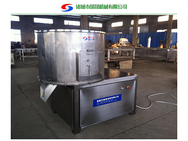 該機(jī)用于豬蹄、豬耳、豬鼻等去毛后的去黃皮、黑皮的工作和去除附著在表面余毛雜物等工作。本機(jī)通過(guò)減速機(jī)帶動(dòng)甩盤(pán)轉(zhuǎn)動(dòng),使物料在筒內(nèi)高速旋轉(zhuǎn)碰撞、摩擦,從而實(shí)現(xiàn)脫黑皮和打毛的要求。